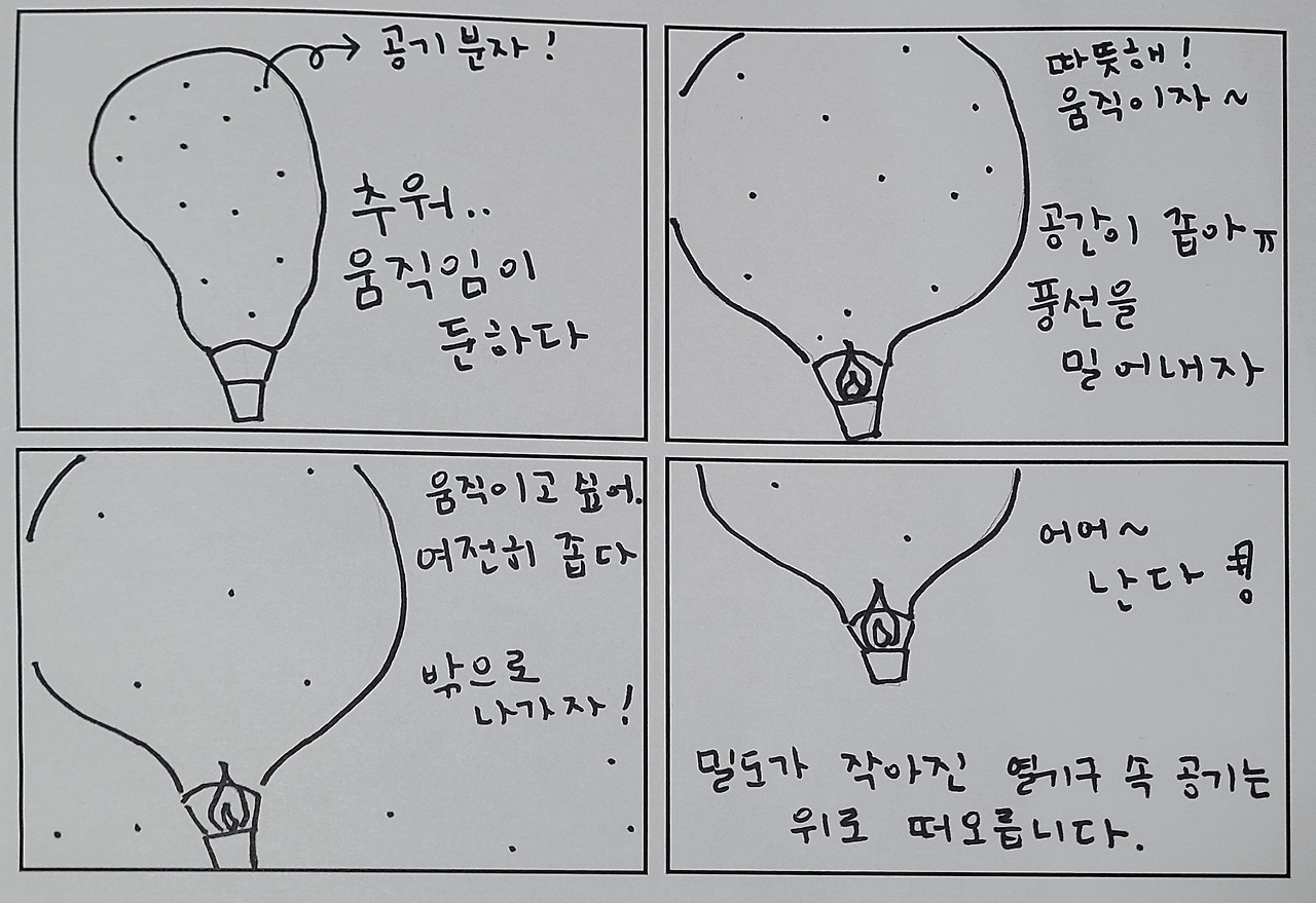 기체 분자의 평균 운동 에너지는 온도에 정비례해 증가한다. 더운 여름에 냄새가 더 빨리 퍼지는 것도 온도가 높아지면 분자의 움직임이 빨라지기 때문이다. 이때 빠르게 움직이는 기체 분자들 사이의 거리가 멀어지면서 기체의 부피가 커지게 된다. 열기구에 불을 붙이면 풍선이 부풀어 오르는 것도 이 때문이다. 풍선이 팽팽한 것은 뜨겁게 가열된 기체 분자들이 활발하게 운동하면서 풍선 벽에 부딪히기 때문인데, 이 과정에서 기체 분자 일부가 풍선 밖으로 빠져나간다. 풍선 속 기체 분자의 수가 줄어들어 밀도가 작아진 풍선은 하늘 높이 떠오르게 된다. 반대로 열기구의 불을 끄면 기체 분자들의 움직임이 느려지면서 여유 공간이 생기게 되고, 바깥의 기체가 풍선 속으로 들어오면서 밀도가 커져 땅으로 내려오게 된다.