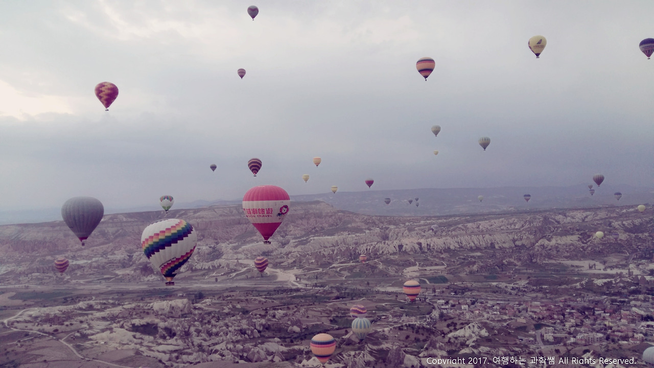 괴레메는 화산재가 쌓여 형성된 암석인 응회암으로 이루어진 마을이다. 사람들은 쉽게 부스러지는 이 암석들에 구멍을 내어 독특한 동굴 형태의 집이나 종교시설을 만들었다. 기이한 형태의 암석 각각은 동물 같기도 하고 나무나 구름처럼 보이기도 했는데, 땅에서 멀어질수록 미로처럼 얽힌 개미집으로 보였다. 보는 사람들마다 제각기 다른 서술어를 사용해 기묘한 괴레메의 암석들을 표현하리라. 태양의 고도가 높아지고 열기구의 위치가 바뀌면서괴레메의 암석들은 분홍색으로, 주황색으로, 또는 상아색이나 노란색으로 시시각각 다양한 빛을 내었다. 비슷하면서도 조금씩 다른 추상화처럼 파스텔톤 색깔들이 잠에서 깨어나 움직였다. 빛으로 춤추는 마을 위로 거대한 풍선들이 파티장의 종이꽃가루처럼 흩날렸다. 내가 탈 열기구가 아니길 바랬던 칙칙한 회색 풍선조차 존재감을 드러내며 쨍하게 빛났다. 마을 전체가 살아 있었다.