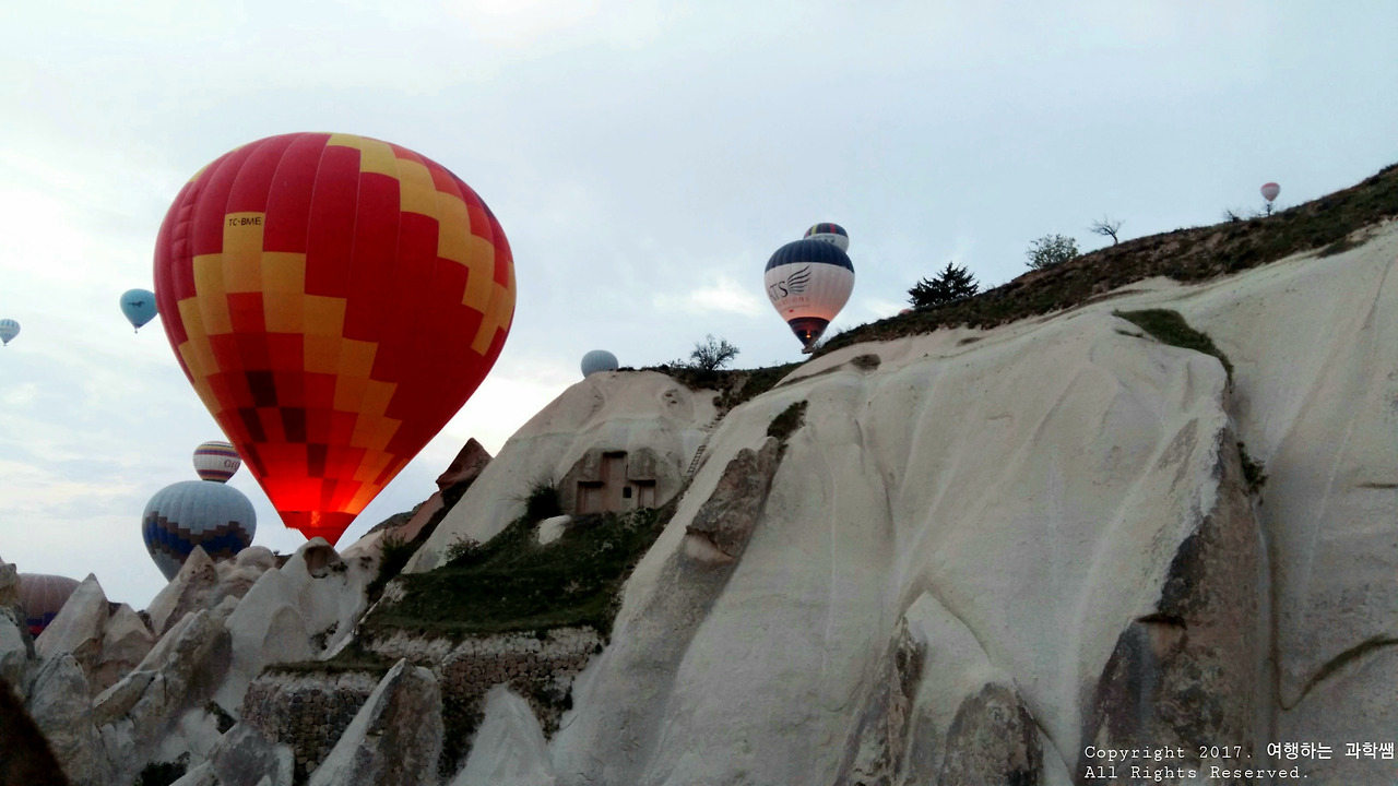 우리는 열기구의 불을 조절하면서 마을의 새벽 파티에 동참했다. 불이 꺼지면 암석 가까이 내려간다. 곳곳에 뚫린 동굴 안에 누가 살고 있나 보일 정도로 암석들이 다가온다. 닿을까 불안해질 때쯤이면 열기구 바구니 가장자리에 바짝 붙어 매혹적인 마을을 바라보는 등허리 뒤로 뜨거운 불길이 치솟았다. 다시 파티장의 가장 높은 곳으로 올라가 춤추는 종이 꽃가루가 될 시간이었다.