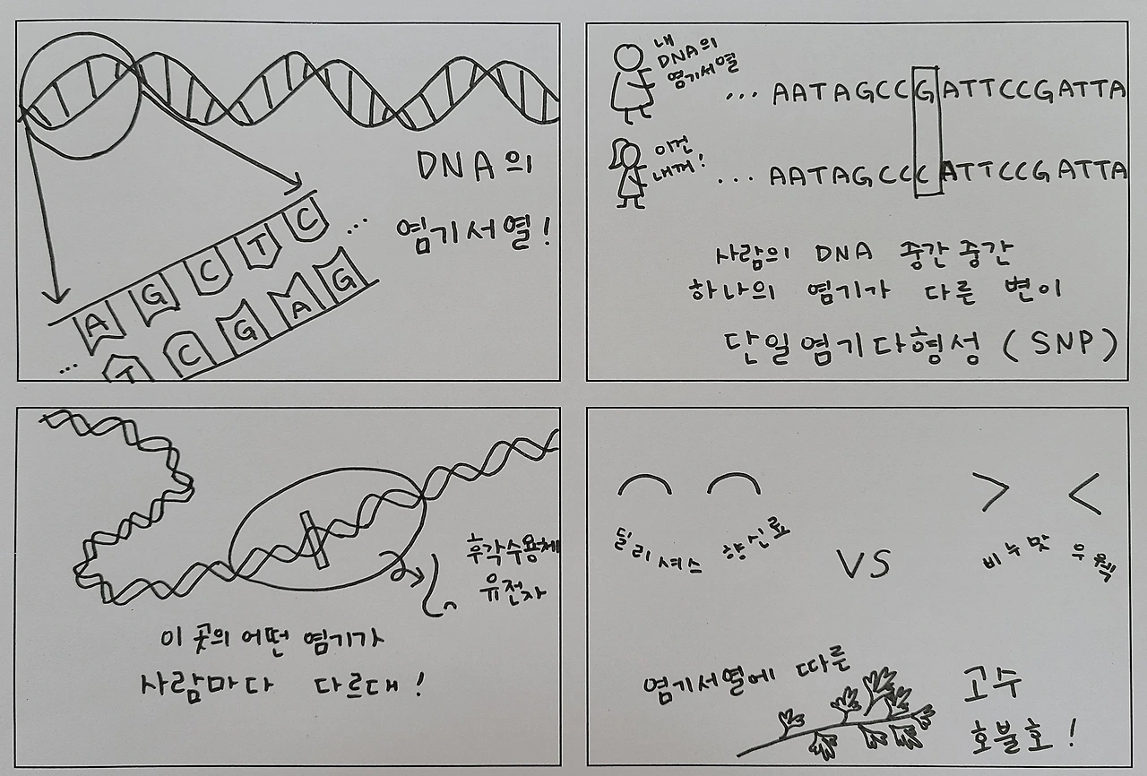 사람의 유전물질인 DNA는 뉴클레오타이드라는 기본 단위체가 길게 결합되어 있는 형태다. 각각의 뉴클레오타이드에는 아데닌(A), 구아닌(G), 사이토신(C), 타이민(T)의 네 가지 염기 중 하나가 포함되어 있으며, 뉴클레오타이드가 길게 결합할 때 이 염기들의 나열 순서에 따라 생명체의 유전자가 결정된다. 모든 사람의 DNA 염기서열은 99% 이상 동일하며, 1% 이하의 염기서열 차이가 각 개인의 고유한 특성을 결정한다. 이때 동일한 염기서열 중간에 사람마다 단 하나의 염기가 차이 나는 부분이 있는데 이러한 DNA 변이를 단일 염기 다형성(SNP)이라 한다. 11번 염색체의 후각 수용체 유전자 부분에 위치한 단일 염기 다형성(SNP)에 의해 고수에서 비누 향을 느끼는 사람과 그렇지 않은 사람이 나뉠 것이라는 추론이 연구의 주된 내용이다.