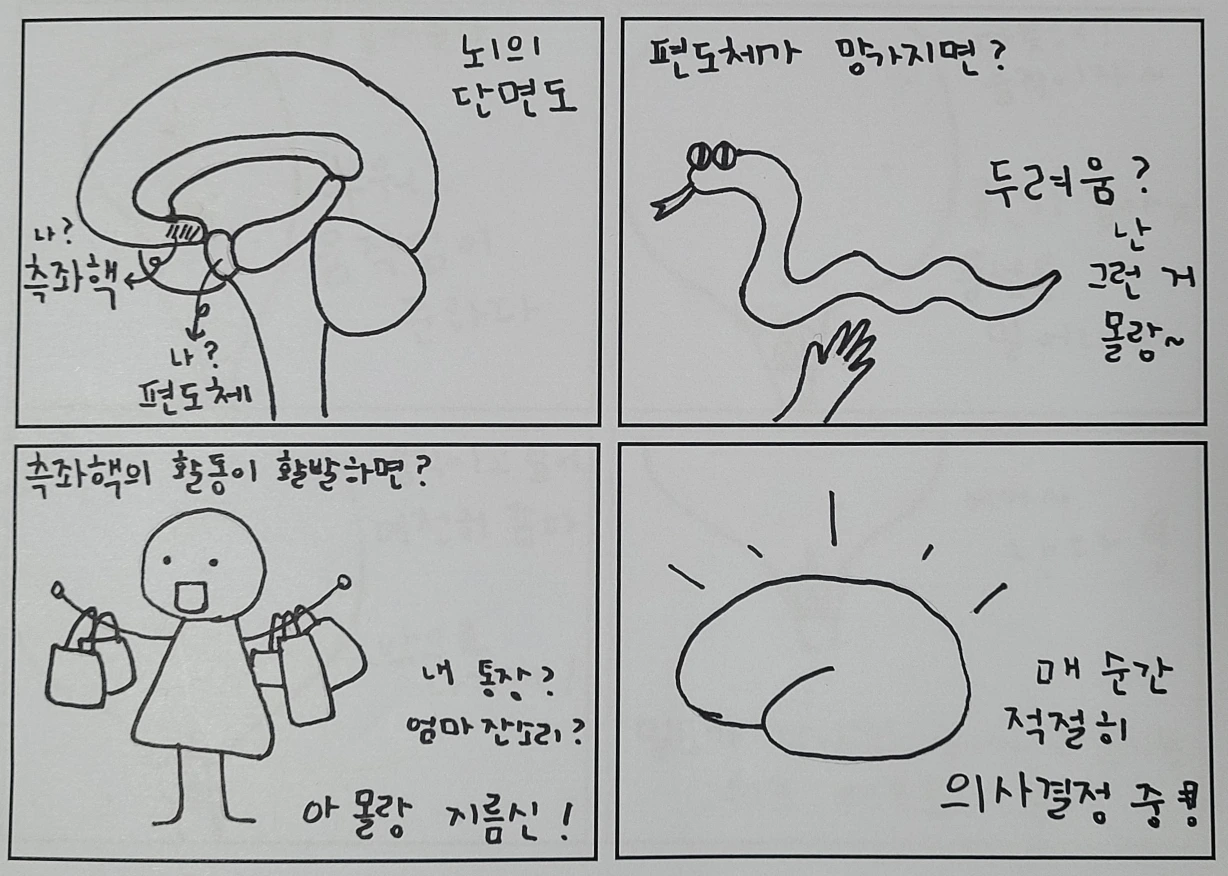 변연계에는 아몬드 모양의 편도체가 있다. 주의 집중이나 감정 처리와 관련된 부분이다. 특히 본능적인 공포나 불안감, 불쾌함을 불러일으켜, 그 공포를 없애는 안전한 방향으로 행동하게끔 유도한다. 낯선 환경에 대해 본능적인 공포를 느끼는 것, 피식자가 포식자를 두려워하는 것은 모두 편도체에 의한 현상이다. 편도체가 파괴된 쥐는 고양이를 두려워하지 않는다고 하니 공포와 불안은 생존을 위해 꼭 필요한 감정인 것이다. 사람의 경우에도 편도체가 망가진 환자는 위험한 물건에 망설임 없이 손을 대고 기이한 상황에서 아무런 위험 신호를 느끼지 못한다.