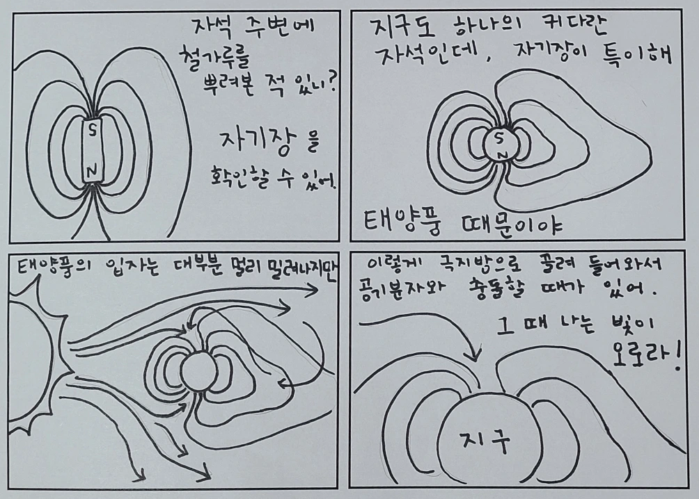 우리가 밟고 서 있는 땅과 우주 사이에는 지구를 둘러싼 대기층이 있다. 그리고 대기층보다 더 먼 곳으로 지구 자기장이 뻗어져 있다. 지구 내부의 외핵을 구성하는 액체 금속이 회전하면서 지구는 하나의 커다란 자석처럼 행동하는데, 지구의 자기력이 미치는 공간을 지구 자기장이라 한다. 대기층과 지구 자기장은 우주에서 오는 많은 것들로부터 우리를 보호해준다. 태양의 표면 활동에 따라 방출되는 태양풍도 지구에게는 위험한 손님이다. 태양과 같이 매우 뜨거운 온도에서 물질들은 전하를 가진 플라스마라는 상태로 존재하는데, 이 입자들이 지구에 도착하면 대기층의 기체 분자들과 충돌하여 빛을 낸다. 기체의 종류와 밀도, 충돌 위치에 따라 다양하게 보이는 몽환적인 빛의 왈츠를 오로라라고 부른다.