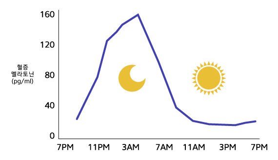 멜라토닌은 하루 주기의 생체리듬을 담당합니다. 수면의 호르몬이라고 합니다. 새벽 1시~5시 사이에 많이 분비되어 수면 욕구를 발생시킵니다. 점점 길어지는 일조시간은 멜라토닌의 분비량을 서서히 감소시키게 됩니다.