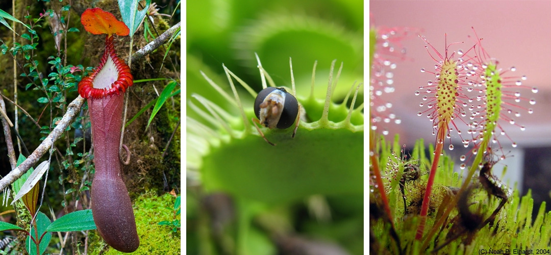 먹이를 잡을 수 있는 주머니는 포충낭이라고 하는데 벌레잡이통풀과 같은 종들이 포충낭을 가지고 있습니다. 파리지옥과 같은 풀은 포충엽이라고 하는 잎을 열고 있다가 적당한 먹이가 들어오면 포충엽을 닫아버립니다. 끈끈이주걱과 같은 풀은 빽빽하게 나 있는 선모에서 점액을 분하여 꽃으로 착각하고 날아온 곤충들을 꼼짝 못 하게 하여 잡아먹습니다.