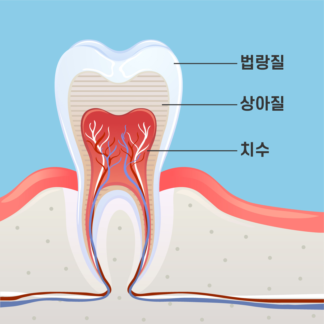 사람의 이는 크게 법랑질(琺瑯質, enamel), 상아질(象牙質, dentin), 치수(齒髓, pulp)로 구분할 수 있습니다. 치수는 혈관과 신경이 분포된 연한 결합조직이에요. 반면에 법랑질과 상아질은 수산화인회석(hydroxyapatite, Ca(PO4)6(OH)2)이라는 무기질과 콜라겐(콜라젠), 물로 이루어져 있고 치수보다 딱딱합니다. 세 가지 구성 성분의 상대적인 비율과 구조, 분포에 따라서 이빨의 단단하기가 달라지지요. 이렇게 생명체 안에서 유기물과 무기물을 이용하여 돌처럼 단단한 조직이 만들어지는 것을 광물화라고 합니다. 투명 또는 반투명한 법랑질은 수산화인회석의 비율이 무게의 약 97%나 되어서 인체 중 가장 단단한 조직이에요. 상아질은 70% 정도의 무기질과 18%의 콜라겐(콜라젠)이 결합하고 있어서 법랑질보다는 덜 단단합니다. 연한 노란빛을 띠는 치아 특유의 색은 상아질의 색이라고 볼 수 있어요. 특히 상아질에는 가느다란 관(세관, tubule)이 있는데, 치아의 전형적인 색깔을 결정하고 상아질을 덜 단단하게 만듭니다. 이런 특성은 포유류뿐만 아니라 이빨이 있는 어류에서도 유사하게 나타납니다. 피라냐나 백상아리의 상아질과 인간의 상아질은 비슷한 단단함을 보인다고 알려져 있어요.