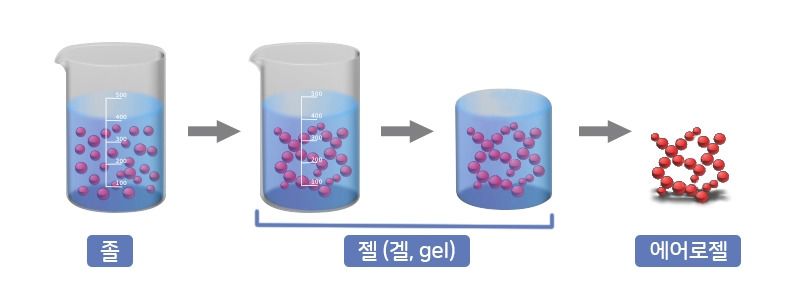 냉동 연기(frozen smoke), 푸른 연기(blue smoke) 등 다양한 별명을 가지고 있는 에어로젤은 3차원 그물 구조 안에 기체가 채워진 다공성 구조체입니다. 만드는 방법을 알면 개념을 더 쉽게 이해하실 수 있을 거예요. 가장 왼쪽에 있는 그림처럼 액체 안에 1㎛(마이크로미터)보다 작은 고체 입자가 퍼져 있는 것을 졸(sol)이라고 부릅니다. 젤라틴 가루를 물에 풀어놓은 상태와 같습니다. 졸을 냉각하거나 가열해서 굳히면 입자들이 3차원적으로 연결되어, 고체 안에 액체가 갇힌 젤(겔, gel) 상태가 됩니다. 마치 젤리처럼요. 그릇 안에 있는 젤리를 뒤집어서 꺼내면, 찰랑찰랑 흔들리지만, 그릇에 담겨있던 형태를 그대로 유지하지요? 교차결합으로 형성된 3차원 구조 덕분입니다. 마지막으로 젤을 특수한 조건에서 건조시켜 액체를 제거합니다. 그러면 다 쓴 방향제처럼 쪼그라들지 않고 형태가 유지된 에어로젤을 얻을 수 있습니다.