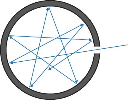 실제 흑체는 존재하지 않으나 그림처럼 흑체를 상상할 수 있다. 작은 구멍으로 들어온 빛은 나가지 못하고 흑체 안에서만 존재하게 된다. 빛이 계속 구멍을 통해 들어오면 흑체가 가열되고 전자기파를 내놓게 된다.