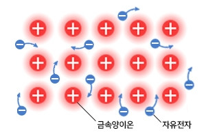그래서 금속 안에서 자유전자들은 비교적 자유롭게 돌아다니지만 주변 금속이온과 서로 끌어당기는 전자기력이 유지됩니다. 금속은 이렇게 자유전자와 금속이온 사이의 전기적 인력으로 서로를 끌어당기며 금속결합을 유지합니다.