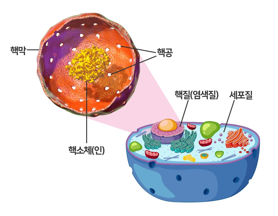 동물이나 식물같은 진핵생물은 세포마다 하나의 핵을 가집니다. 핵에는 생물의 유전정보를 담은 DNA 사슬이 빽빽하게 뭉쳐진 염색사가 존재합니다. 평소에는 염색사 형태이지만 핵분열 때에는 서로 뭉쳐 염색체가 되지요. 핵에는 핵공이란 구멍이 있어 RNA가 드나들 수 있습니다. 세균같은 원핵생물들의 세포에는 핵이 없는 대신 DNA가 세포질 내에 고리모양으로 떠다닙니다.