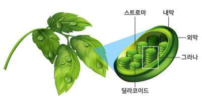 엽록체는 식물이나 조류(algae)에서 광합성을 담당하는 세포 소기관입니다. 원래 독립된 세균이었으나 진핵생물의 세포 내에서 공생하면서 현재와 같은 세포 소기관이 되었습니다. 엽록체는 미토콘드리아처럼 외막과 내막의 이중막 구조로 되어있습니다. 틸라코이드라는 내막으로 이루어진 디스크가 쌓여있는 그라나에서는 빛을 받아들여 물을 분해하고 스트로마라는 기질에서는 이산화탄소를 재료로 하여 포도당을 만듭니다.