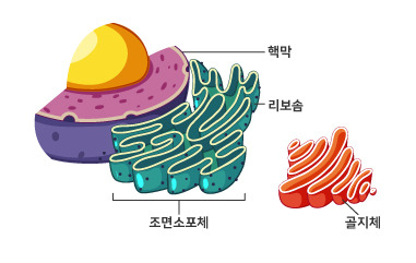 골지체 또한 소포체처럼 막 구조로 된 세포 내 소기관으로 단백질을 전달하는 것을 주요 임무로 하지요. 조면소포체에서 만들어진 단백질은 골지체를 통해 세포 곳곳으로 전달됩니다.