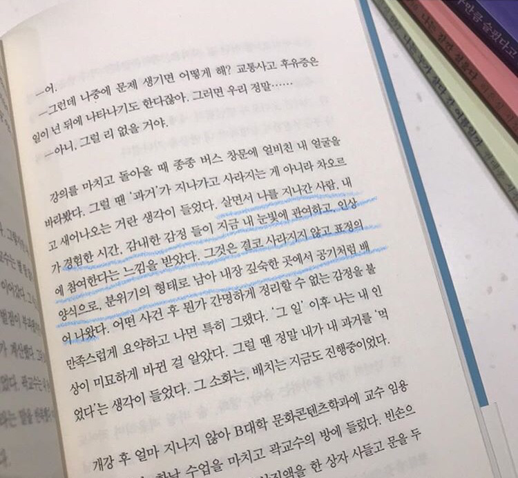 “강의를 마치고 돌아올 때 종종 버스 창문에 얼비친 내 얼굴을 바라봤다. 그럴 땐 '과거'가 지나가고 사라지는 게 아니라 차오르고 새어 나오는 거란 생각이 들었다. 살면서 나를 지나간 사람, 내가 경험한 시간, 감내한 감정 들이 지금 내 눈빛에 관여하고, 인상에 참여한다는 느낌을 받았다. 그것은 결코 사라지지 않고 표정의 양식으로, 분위기의 형태로 남아 내장 깊숙한 곳에서 공기처럼 배어 나왔다.”