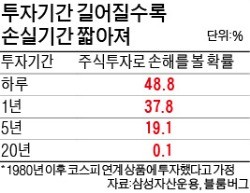 그렇다면 그래프에서 보이는 변동성은 결국 투자자의 리스크로 돌아오는 것이 아닌가라는 질문을 던질 수 있다. 하지만 우리가 시겔 교수의 저서와 국내 데이터에서도 확인했듯이, 시간은 변동성을 이긴다. 삼성자산운용의 자료에 따르면 투자기간이 길어질 수 록 주식투자로 손해를 볼 확률은 획기적으로 낮아진다. 하루 동안 주식에 투자했을 경우 손해를 볼 확률은 48.8% 였지만 5년 투자 시 그 확률은 19.1%까지 낮아졌고 20년 투자 시에는 거의 100%에 가까운 확률로 주식투자에서 수익을 얻을 수 있었다.
