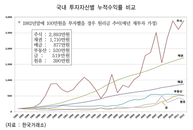 굳이 그래프를 보지 않아도 현재의 코스피 종합주가지수 (12월 22일 현재 2,440)를 한국 주식시장이 처음 개장했을 때의 지수 100과 비교하면 어림잡아 37년에 2,440%의 수익을 올렸다는 계산이 나온다. 연 수익률로 계산하면 매년 약 9%의 수익률이 된다. 어떤 좋은 주식을 골라서 9%의 수익을 얻었다는 것이 아니라 주식시장 전체의 성장이 연평균 9%였다는 얘기로 해석될 수 있다. 그렇다면 국내 투자자산별 누적수익률은 어떨까?