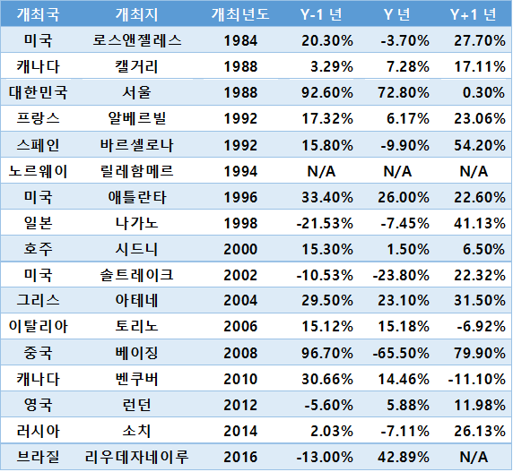 표에서 볼 수 있듯, 대회 기간 간주가 변화는 역사적으로 어떠한 상관관계를 찾기 어렵다. 심지어는 흑자 올림픽의 대표적인 사례로 언급되는 릴레함메르 겨울 올림픽 개최기간 중에 노르웨이의 주식시장은 -4.42% 하락하였고, 소치올림픽 때는 주가 변화가 1% 미만이었다.