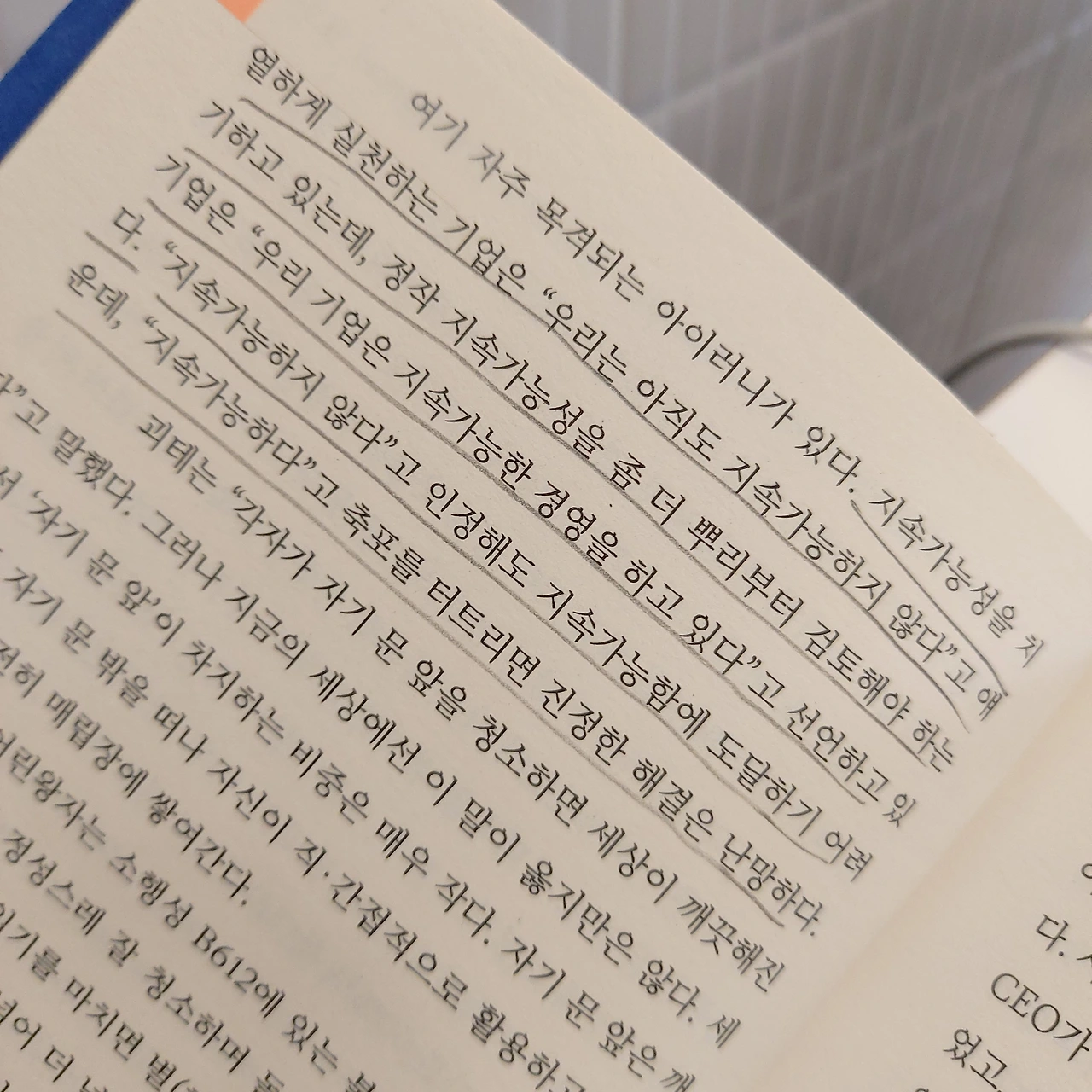 그 믿음을 기반으로 자본주의로 인해 파괴된 환경을 그 이전으로 되돌릴 수 있도록 하는 모습을 보여주는 게 아닐까. 그 믿음이 너무나도 확고하고, 이렇게라도 해야만이 기업과 사회가 지속가능성을 담보할 수 있다고 믿기 때문 아닐까. 그렇기 때문에 가장 앞장서서 행동하는 게 아닐까.