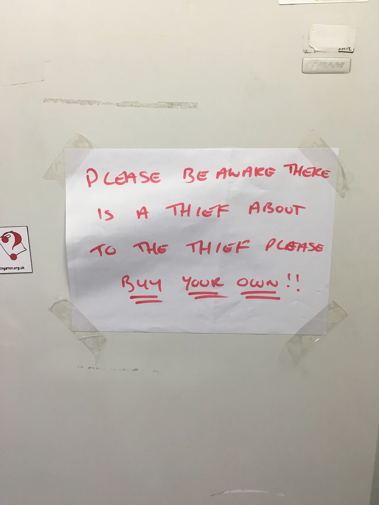 탕비실 냉장고에 붙어있던 “니 우유를 사란 말야! 이 도둑놈아!!”