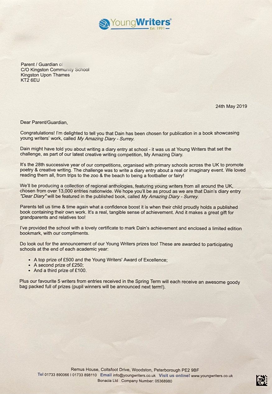 처음 이 레터를 받았던 건 영국에 간 첫해였던 2018년이었다. 학교에서 레터가 왔을 때만 해도 아이가 학교에서 글을 써서 공모전에 참가했다는 사실을 몰랐다. 학교 수업시간에 글을 쓰고 아이들이 다 같이 출품했던 것이었다. 아직 만 6-7세의 아이들이 쓴 글이니 스펠링 같은 것을 고쳐서 책을 발간하는데 실어도 되겠느냐는 동의를 구하는 레터였다. 영국은 2-3학년 때 쓰기를 매우 중시 여긴다. 1학년 때는 파닉스에 맞게 글자를 쓰고 2학년 때는 그것이 완성되어야 했고, 2학년에는 이와 같이 약간은 문학적인 감각을 익혀가고 표현하는 것을 한다. 영국의 수업들을 보면 일부가 아니라 모두가 문학적 스피릿을 공통의 가치로 일궈 나간다는 느낌을 받을 수 있었다. 3학년이 되면 손글씨를 예쁘게 쓰는 것에 집중하는 주제를 갖게 된다. 3학년이 되면 2학년까지는 필통도 없이 등교하던 아이들이 펠트팁펜, 만년필 같이 정확하게 필기도구를 준비하는 것을 학교에서 안내한다. 그렇게 단계적으로 그리고 종합적으로, 정신적 물리적으로 쓰기를 중시하는 것이 영국이었다. 그때는 ‘타이핑의 시대인데 너무 아날로그적인 거 아냐?’하는 생각도 했지만, 아이가 학년 진학을 해보니 글씨를 단정히 쓰는 것은 글씨 외에 태도나 집중력 등 여러 방면으로 중요했다.