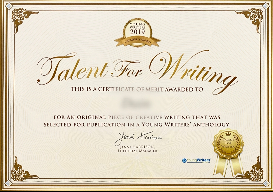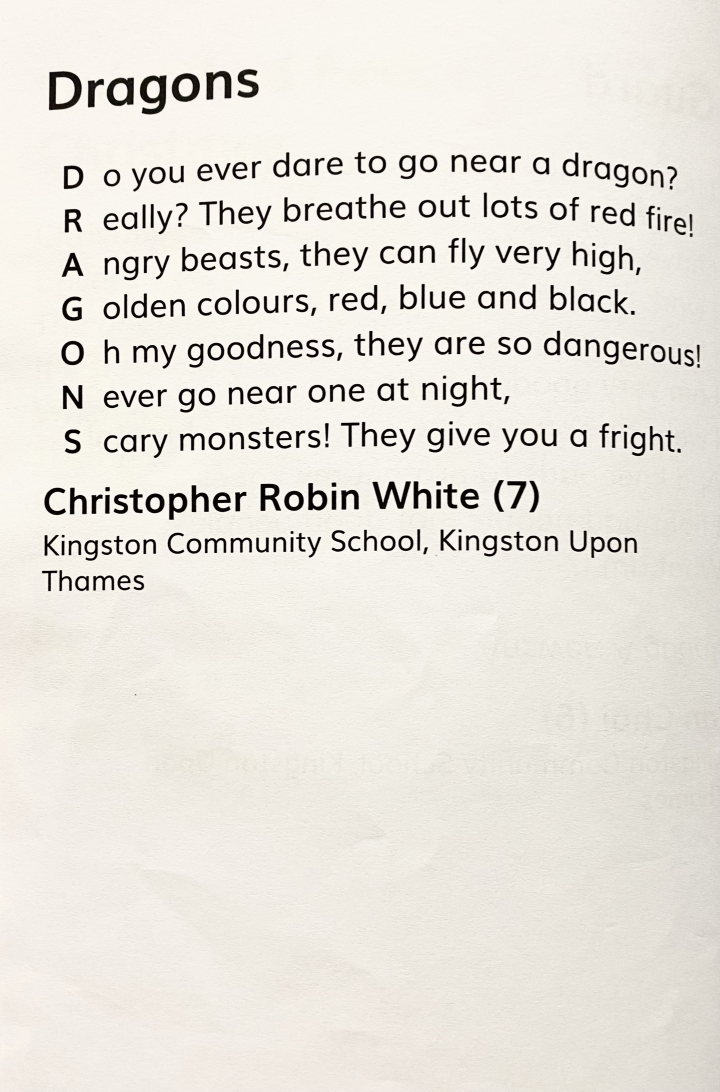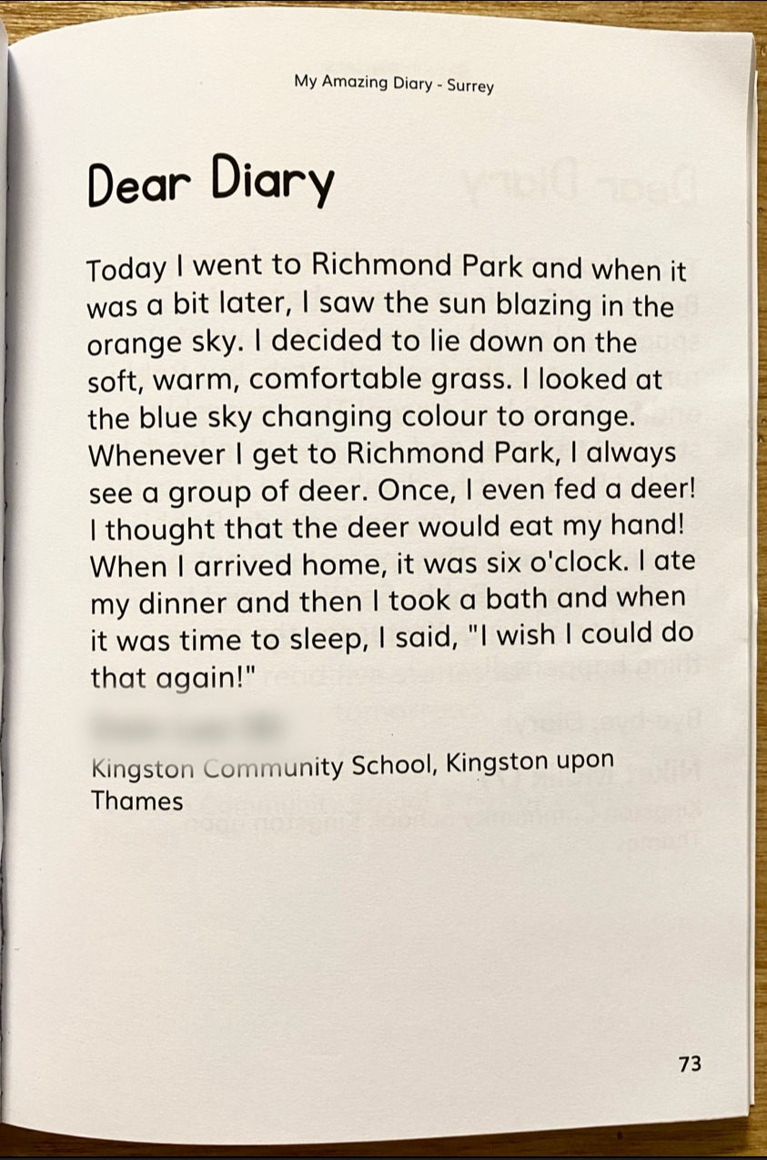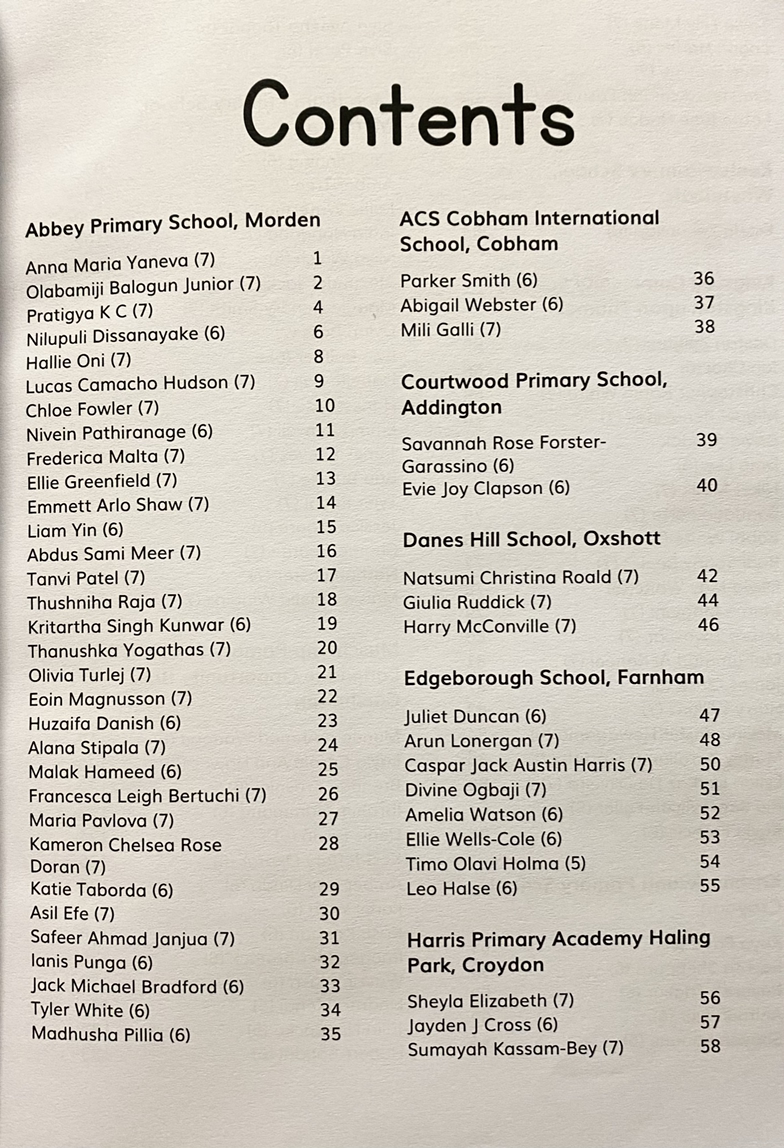출간을 동의하고도 몇 달이 지나고 책이 안 나오는 건가 포기하고 해가 바뀌어서야 책을 받아볼 수 있었다. 목차를 보고서야 알았다. 역시 영국이었다. 누가 진짜 작가 소질이 있는지 평가해서 상을 주고 출간했다기보다는, 아이들이 글쓰기에 흥미와 자부심을 가질 수 있도록 되도록 많은 아이들이 글을 출품하고 책에 실어주는 행사였던 것 같다.