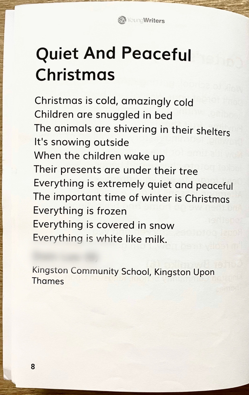 2019년에는 아이들이 시 쓰기를 배웠고 시 공모전이 있으니 다양한 시의 형식 중에 하나 골라 써 오라는 숙제를 받아왔다. 아이는 크리스마스에 대한 환상을 가득 담아 따뜻하고 평화롭고 사랑스러운 크리스마스 아침에 대한 시를 썼다. 2018년에 출간 신청받은 책도 2019년에 받았는데 2019년에 신청한 책을 귀국하기 전에 받을 수나 있을까 싶었지만 다행히 출국 전에 책을 받을 수 있었다. 물론 이때도 많은 아이들의 글이 수두룩 실렸다. 아이들이 쓴 시 몇 편을 구경해보자.