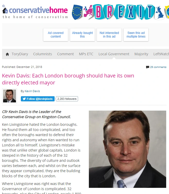 그렇게 한인 친화적이었던 Kevin은 32개 런던 구의 시장 직선제를 주장하는 글을 보수당지에 썼었다. 이원화된 시스템으로 인해 빠르고 추진력 있게 사업 진행되지 않는다는 이유였다. 일의 추진이 상상 그 이상으로 느린 킹스턴에서는 상당히 타당한 이야기이다.