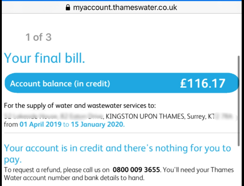 수도는 런던의 가장 대표적인 수도회사인 Thames Water였는데, 1년 치 수도세를 한 번에 내는 구조였기 때문에 반드시 환불을 받아야 했다. 인터넷으로 해지 신청을 수월하게 할 수 있었고 환급 금액도 바로 고지되어서 돈이 들어오겠지 했는데 안 들어와서 자세히 보니, 해지는 해지고 환급은 또 별도로 신청해야 한다는 황당한 구조였다.