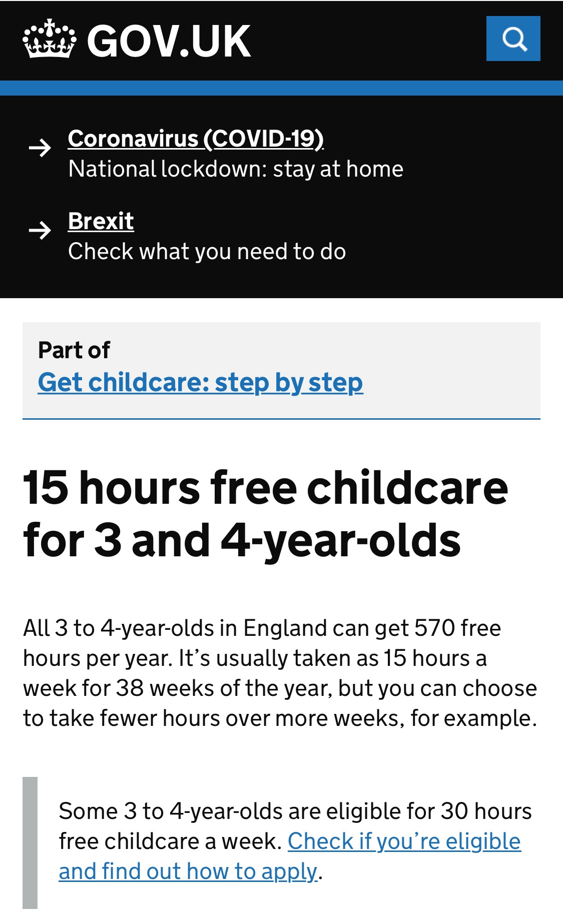 주15시간은 모든 만3-4세에게 무상교육을 지원한다. 30시간 무상교육 지원은 16시간 이상 페이슬립을 증명할 수 있고 소득 기준을 만족해야한다.