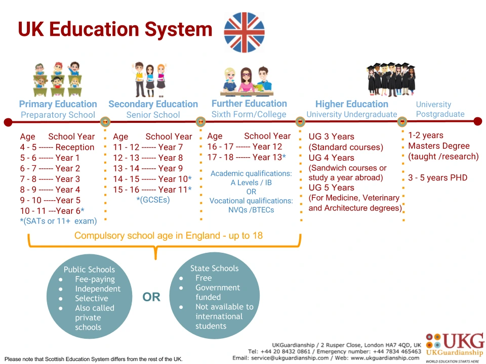우리나라의 학년 시작은 3월이지만, 미국과 영국은 9월에 시작한다. 우리나라는 그해 1월이 출생이 입학의 기준 점이지만, 영국은 그해 8월까지 입학 기준 나이를 충족했을 경우 입한한다. 입학 기준 나이를 산정하는 방법이 8월 기준인 것은 영국과 미국과 같지만, 입학 연령이 미국보다 1년 빠르다. 즉 영국이 1년 빨리 학교를 시작하고 일찍 배운다. 한국과 미국은 만 6세에 1학년, 영국은 만 5세에 1학년이 된다.