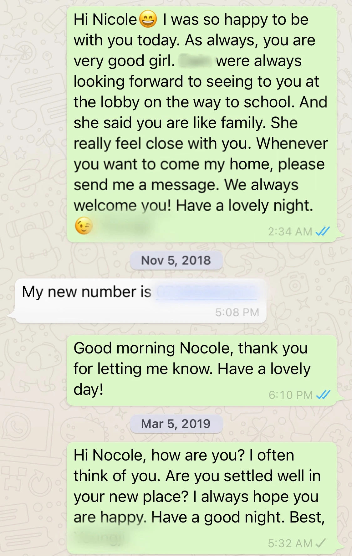 그 이후 차근차근 알게 된 사실들이지만, 니콜에겐 태국에서 태어난 장성한 언니가 있었고, 니콜 엄마가 없을 때는 니콜과 같이 있는 것처럼 이야기했지만, 꼭 사실은 아니었다. 그러니, 니콜은 집에 혼자 있던 날이 많았을 것 같다. 니콜의 엄마는 남자 친구를 만나러 20대처럼 치장하고 나가는 모습을 자주 볼 수 있었다. 니콜이 6년 살던 집에서 원치 않게 나가기 며칠 전에 엄마의 새 남자 친구를 볼 수 있었고, 그 트럭에 올라타는 니콜의 모습의 의미를 나는 알 수가 없었다. 우리를 보던 니콜의 마음도..