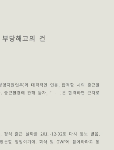 사건을 시간 순으로 정리하는 건 어렵지 않았다. 너무나 생생했으니까. 반면, 증거 자료 수집에서 어려움을 겪었다. 내가 봐도 증거로 제출할 만한 자료가 빈약했기 때문이다. 증거가 되어줄 이메일에서 지사장은 계속 ‘시험’이라는 표현을 썼는데, 다른 사람이 그 자료만 본다면 직접적이고 구체적으로 상황을 파악하기 어려울 듯했다. 중요한 내용이 주로 통화로 안내 되었는데 녹음된 통화도 겨우 1건뿐이었다.