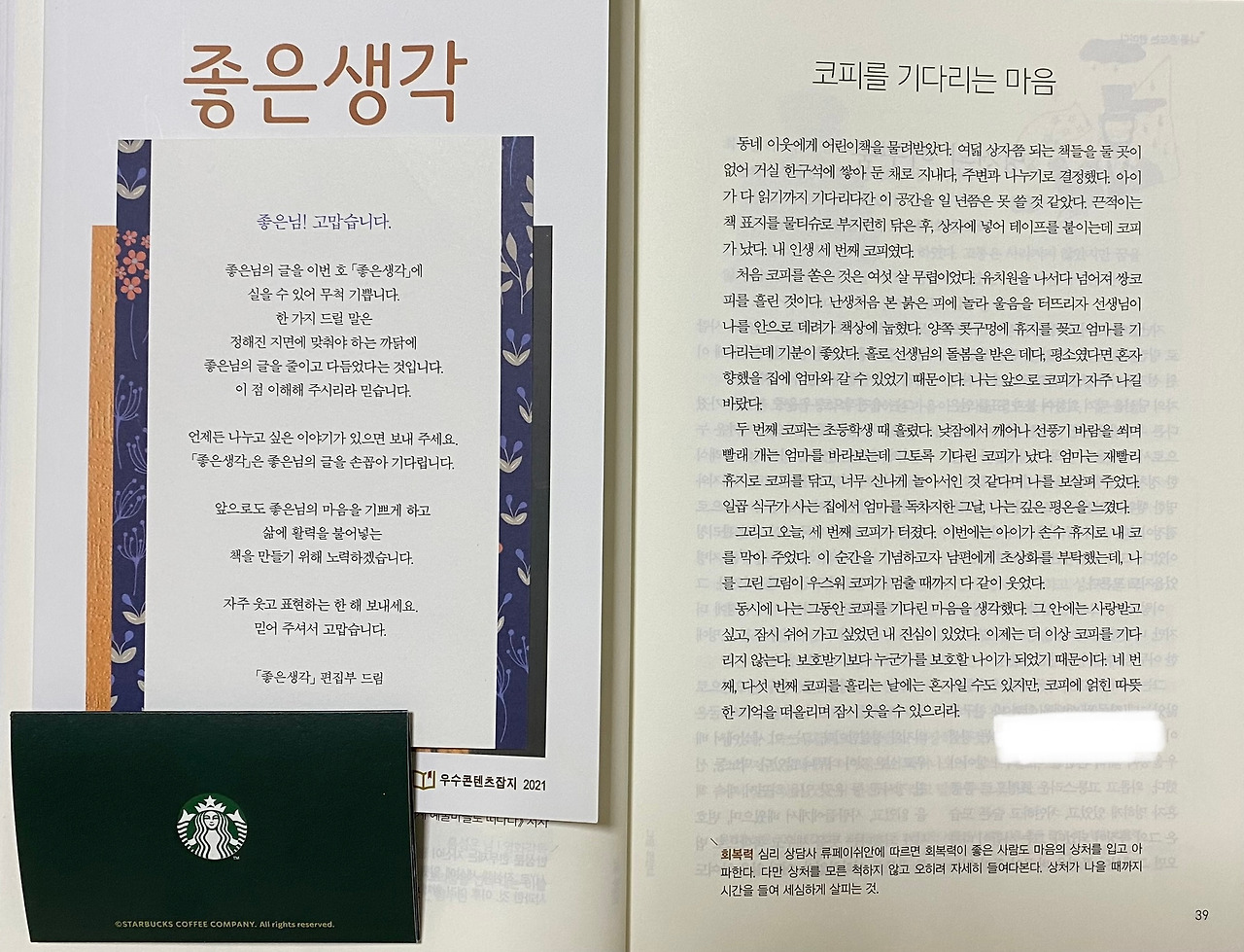 < 작가의 말 : 이 글은 2021년 좋은생각 11월호에 게재된 글의 초고입니다. 어떤 부분이 윤문 되었는지 초고와 비교해 보세요. 글쓰기를 하시는 분들께 도움 되실 것 같아 함께 올려봅니다. >
