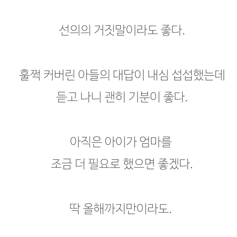 아들 : 그건 엄마가 못 오신다고 해서 말한 거죠.저야 당연히 엄마가 오시면 좋죠.저의 학교 생활을 더 보여드릴 수 있고 하니까 당연히 좋죠.