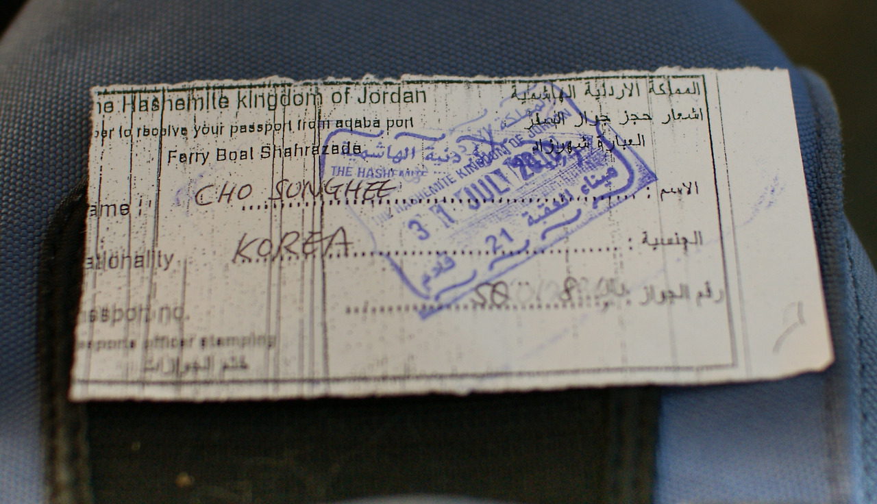 줄을 서면서 언제쯤 내려갈 수 있냐는 질문에 '5분만 기다려.'라는 대답을 들었지만 그 5분이 이후에 5시간이 될 줄은 아무도 몰랐을 것이다. 밤 10시 30분쯤 되니 포기하고, 그저 넋을 놓은 채, 언젠간 이 배에서 내릴 수 있겠지라는 생각으로 버티게 되었다. 결국 그 인고의 시간을 견딘 후, 캐리어를 찾아 끌고 육지로 나오니 밤 11시. 카이로를 떠난 지 정확히 24시간 만에 요르단 땅을 밟게 되었다. 그리고 5분 정도 걸어나와서 가건물 같은 허름한 사무소에서 인적사항을 확인하고 입국도장이 찍힌 여권을 돌려받을 수 있었다. 중동인들 특유의 큰 눈동자와 낯선 이를 강하게 응시하는 시선이 이곳의 거친 분위기와 맞물려 더욱 쫄깃하게 긴장시켰다.