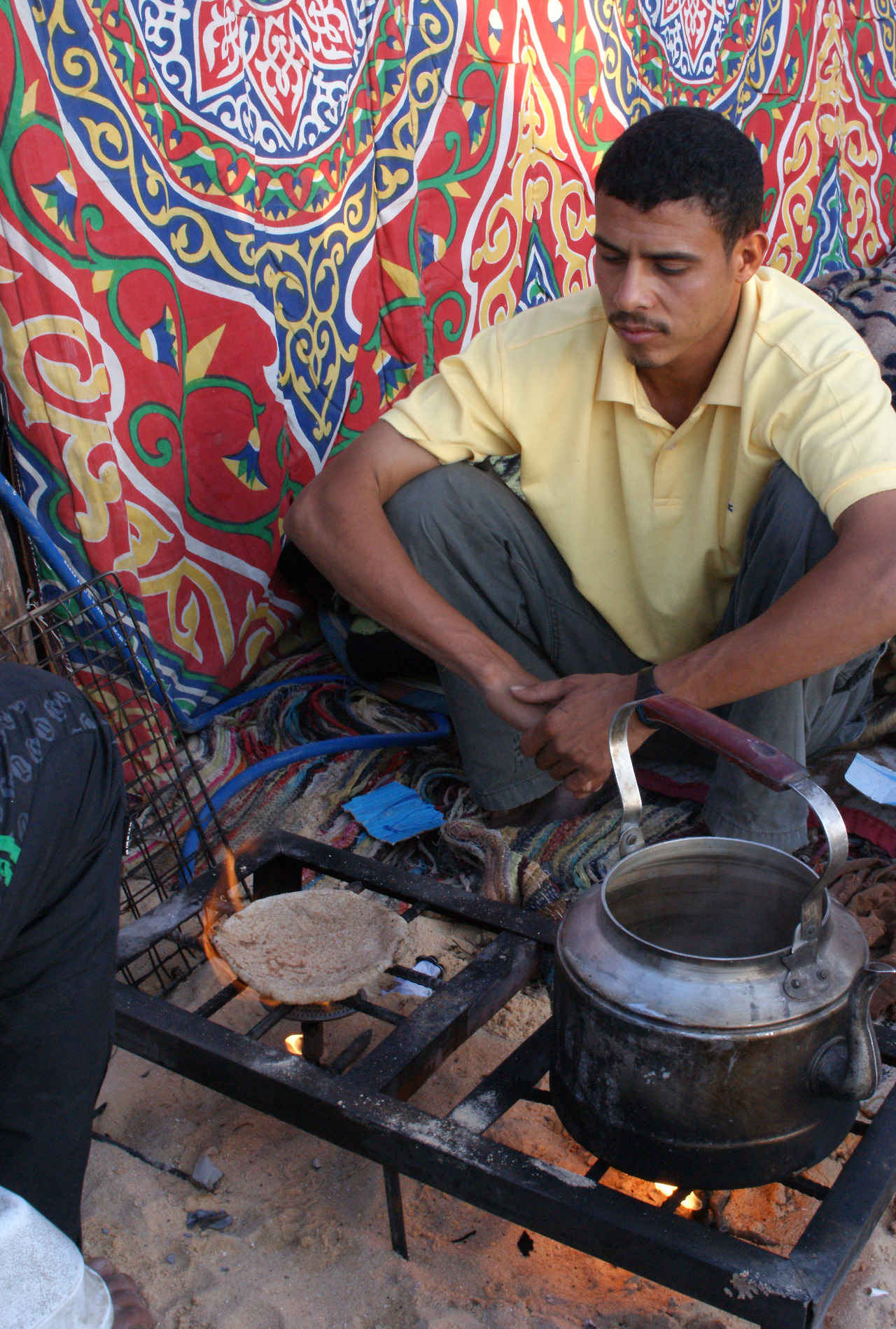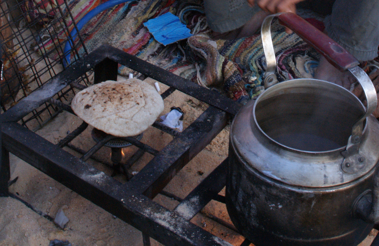 간단히 아침을 차려 먹고, 다시 길을 떠날 준비를 했다. 이 황량한/ 지형지물이 없는 사막에서 아침의 의식을 치르는 일은 몹시 곤란하기도, 어려운 일이기도 했다. 열댓 명의 사람들이 아침 <화장실>을 해결하기 위해 고민을 하기 시작했는데, 누군가 저 멀리 신호를 주며 걸어가니, 모두가 서로 다른 방향으로 멀리 퍼져 슬금슬금 걸어가는 형국이다. 아마 하늘에서 보는 샷이 있었다면, 방사형의 퍼포먼스라도 하듯, 제각기 베이스캠프에서 서로 조금이라도 멀리 떨어지려고 노력하며 걸어갔다. 뒤를 흠칫 흘겨보며, 혹시 같은 방향으로 오는 자가 없나 조심스럽게 확인하며, 사람의 인기척이 보이지 않는 순간, 근처의 아주 소소하게 남아있는 작은 풀들에 기대어 쪼그려 앉아, 생리 의식을 치렀다. 모두가 다른 방향으로 가려니, 꽤 한참을 걸어야 했고, 다시 오는 길도, 혹시나 볼 일을 보시는 누군가와 마주치지 않기 위해, 조심조심, 그러나 나름의 인기척을 내며 돌아왔다. 온몸은 이미 모래밭이고, 세수나 양치는 사치였다. 생수도 귀하고, 물티슈도 귀해서 아주 조금, 눈곱을 떼는 정도로 세안을 마치고, 스카프로 꾀죄죄한 몰골을 가리는 걸로, 아침 단장을 마쳤다.