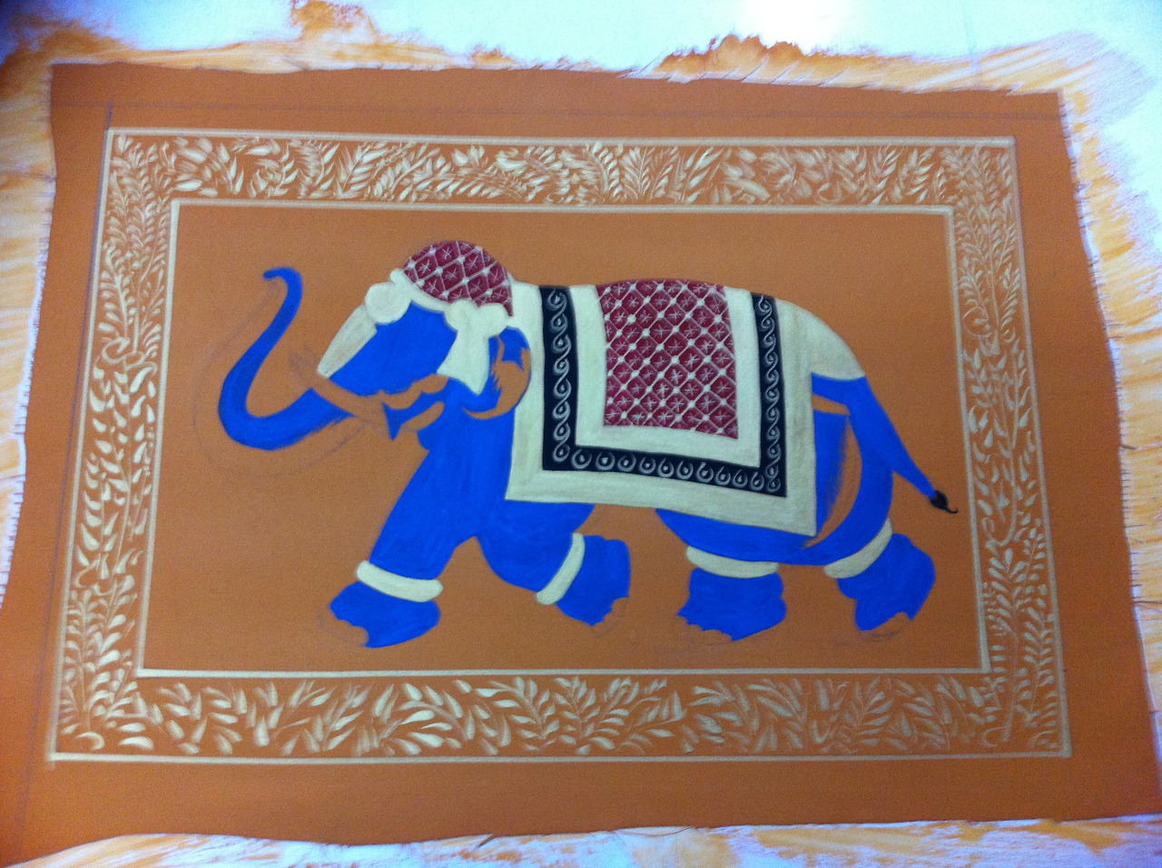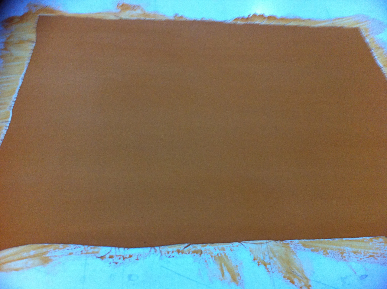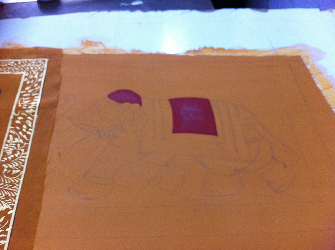 1. 합판에 흰색 실크를 물풀로 붙인 뒤 바탕칠을 하고 말린다. : 실크에 색을 바로 입히면 번지기 때문에 아교 성분의 물로 바탕칠을 잘해두는 것이 중요하다. 우리나라의 채색화 그리는 방식과 흡사했다. 바람 좋고 햇볕 좋은 이곳은, 실크에 밑칠을 하고 널어놓으면 금세 마른다.