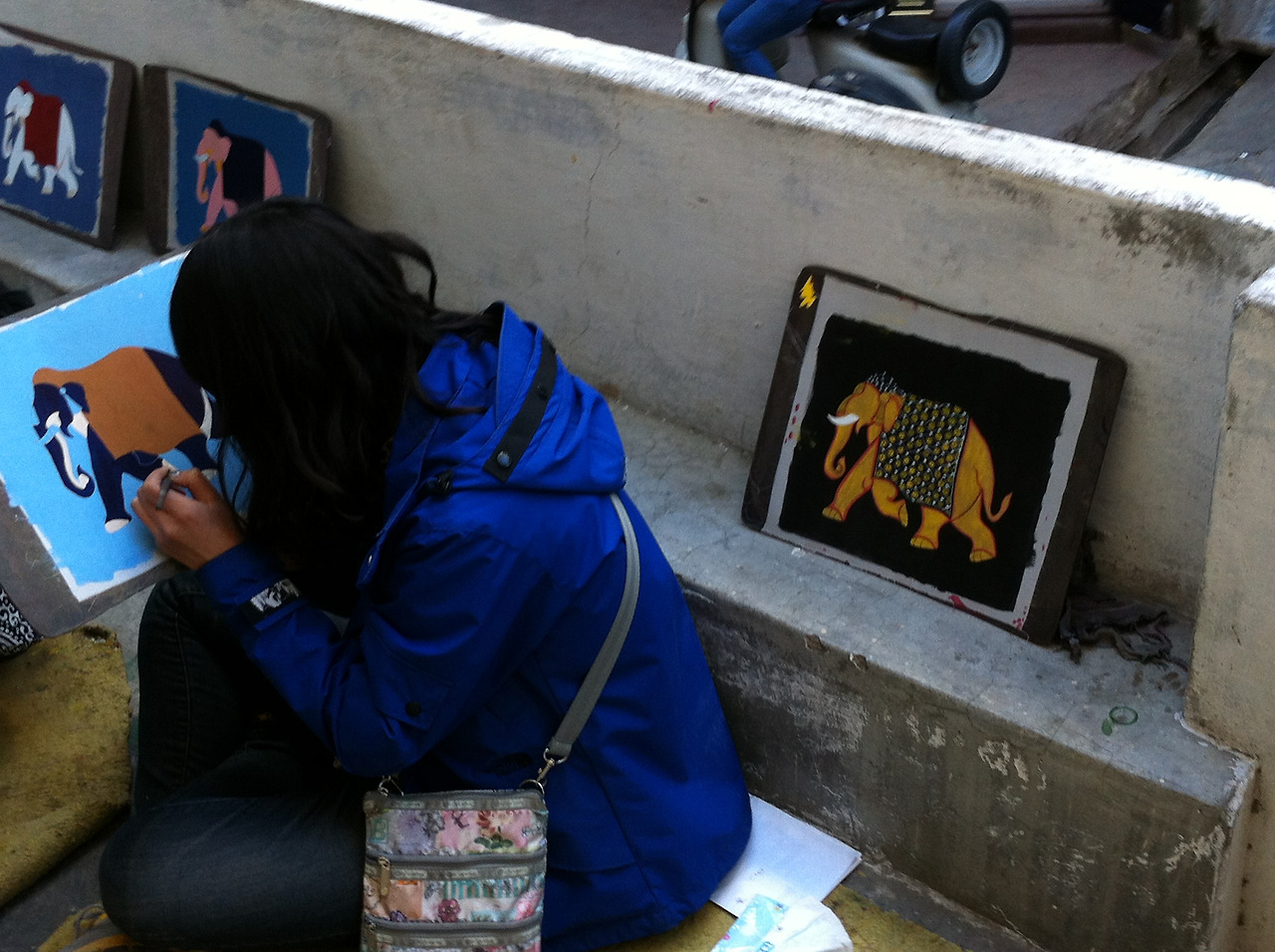 그룹 레슨을 받던 공방은 여행자들이 많이 다니는 길목에 있었는데, 작업실을 겸비한 공방이라 할 것도 없이 근처의 길모퉁이, 계단, 공터에서 작업이 이루어졌다. 창문은 없어도 방이 있던 지난번 뒷골목의 강습소는 양반이었다. 길바닥에 앉아 집중해서 붓질을 하고 있으면 오가던 여행객들이 지켜본 뒤 "A+!"라고 엄지를 치켜들고 구경하고 지나간다. 한국사람들의 길거리 '페인팅 쇼?'를 신기한 듯 보고 가는 서양인들은 절대 붓을 잡으려 들지 않았다. 그들은 그저 주인장의 그림을 구매하는 편.