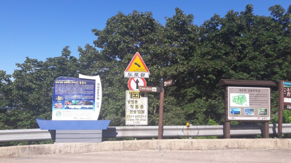 내수전 전망대에는 도로끝이라는 표지판이 있었다. 보통 길의 끝이라고 하면 어떤 여정의 종착지를 떠올리게 된다. 일반적으로 목적지에 도착하더라도 길은 모두 이어져 있고, 갈림길에 멈춰 서는 것은 단순한 선택의 문제라고 생각하기에. 하지만 이 곳은 물리적인, 말 그대로의 길의 끝이었다. 아직 섬을 일주할 수 있는 순환도로가 완공이 되지 않았기 때문이다. 반대쪽 길의 끝은 천부라는 마을이라 하였다. 천부에서 이어지는 관음도 쪽에서부터, 이곳 내수전까지 이어지는 터널은 올해 10월 넘어서야 완공된다는 이야기를 섬에 사시는 주민분에게 들었다. 굳이 따지자면 내수전은 그 중 울릉도를 여행하는 길의 시작점이라고 생각하면 좋을 듯 싶다. 포항에서 출발할 때 들어오는 도동항 역시 이 곳 내수전에 가까운 부분인지라 가장 먼저 들러볼 수 있는 곳이기 때문이다.