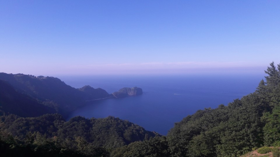 차로 올라온 고도 자체가 다르기 때문인지, 전망대에 다 오르지도 않았는데 울릉도 동편의 경치가 한 눈에 들어왔다. 대한민국의 것이 아닌 듯한 자연은 계속해서 우리와 함께 산비탈을 올랐던 것이다. 감탄은 가쁜 호흡과 함께 쉬지 않고 섞여 나왔다. 맞닿은 듯 나누어진 수평선은 거울이 아닌가 하였다. 마치 하늘에 있어야 할 경치가 비쳐 보인 듯 하였기에.