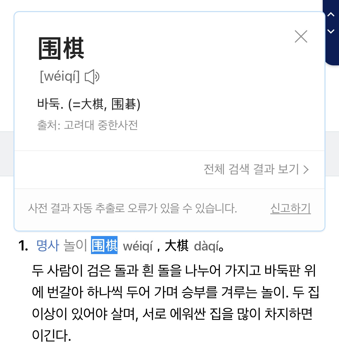 "그러면 중국어로 바둑의 뜻은 '밭 위의 돌싸움'이 아니겠네?"