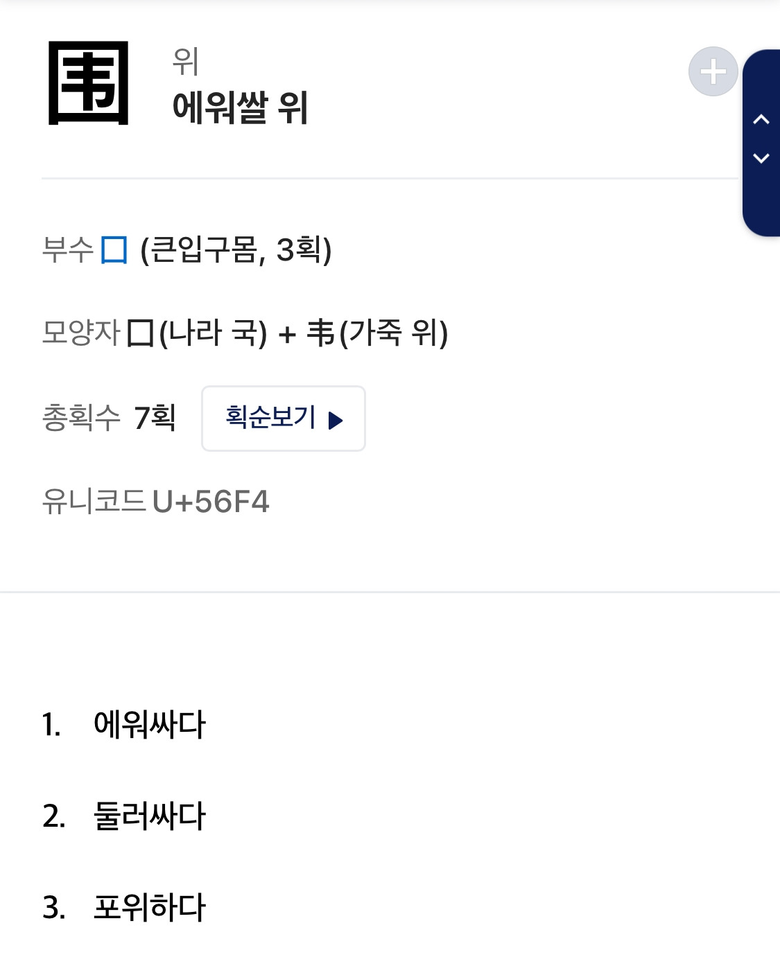 "와, 어릴 때부터 그렇게 많이 썼던 말인데, 이제서야 뜻을 알았네. 우리나라 바둑은 판과 돌의 모양에서 왔고, 중국 웨이치는 게임의 방식에서 온 거란 말이지?"