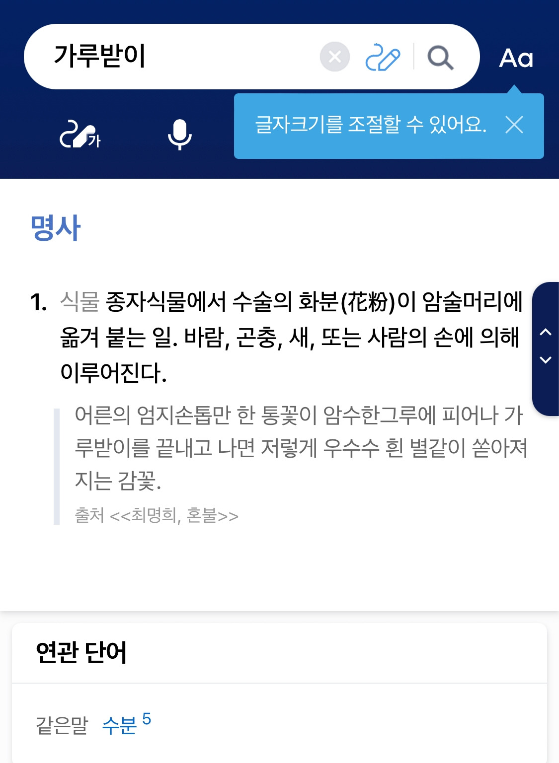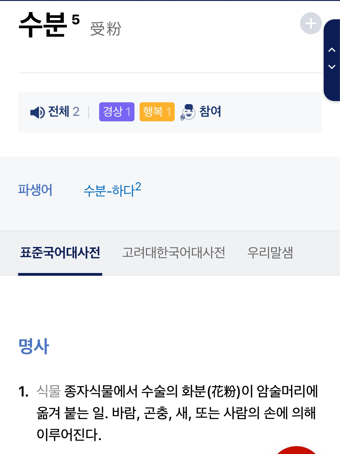 수분(受粉: 받을 수, 가루 분)보다는 가루받이란 말이 대중적 공감을 이끌어내기 좋겠단 생각이 듭니다.