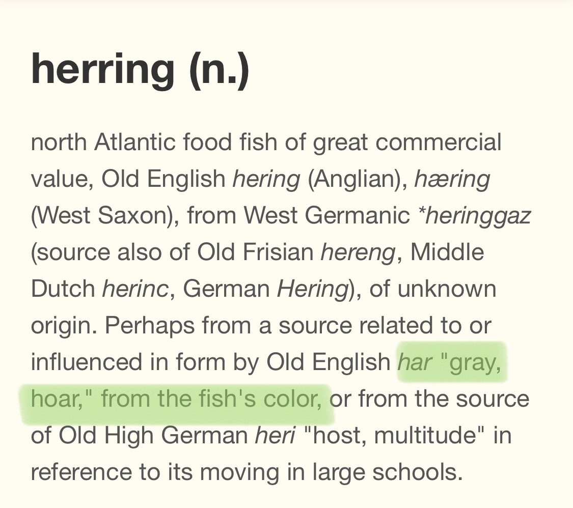 Herring의 정확한 어원은 알려지지 않았지만, 말뿌리로 추정되는 고대영어 har는 회색(gray)/흰 것(hoar)을 뜻합니다.