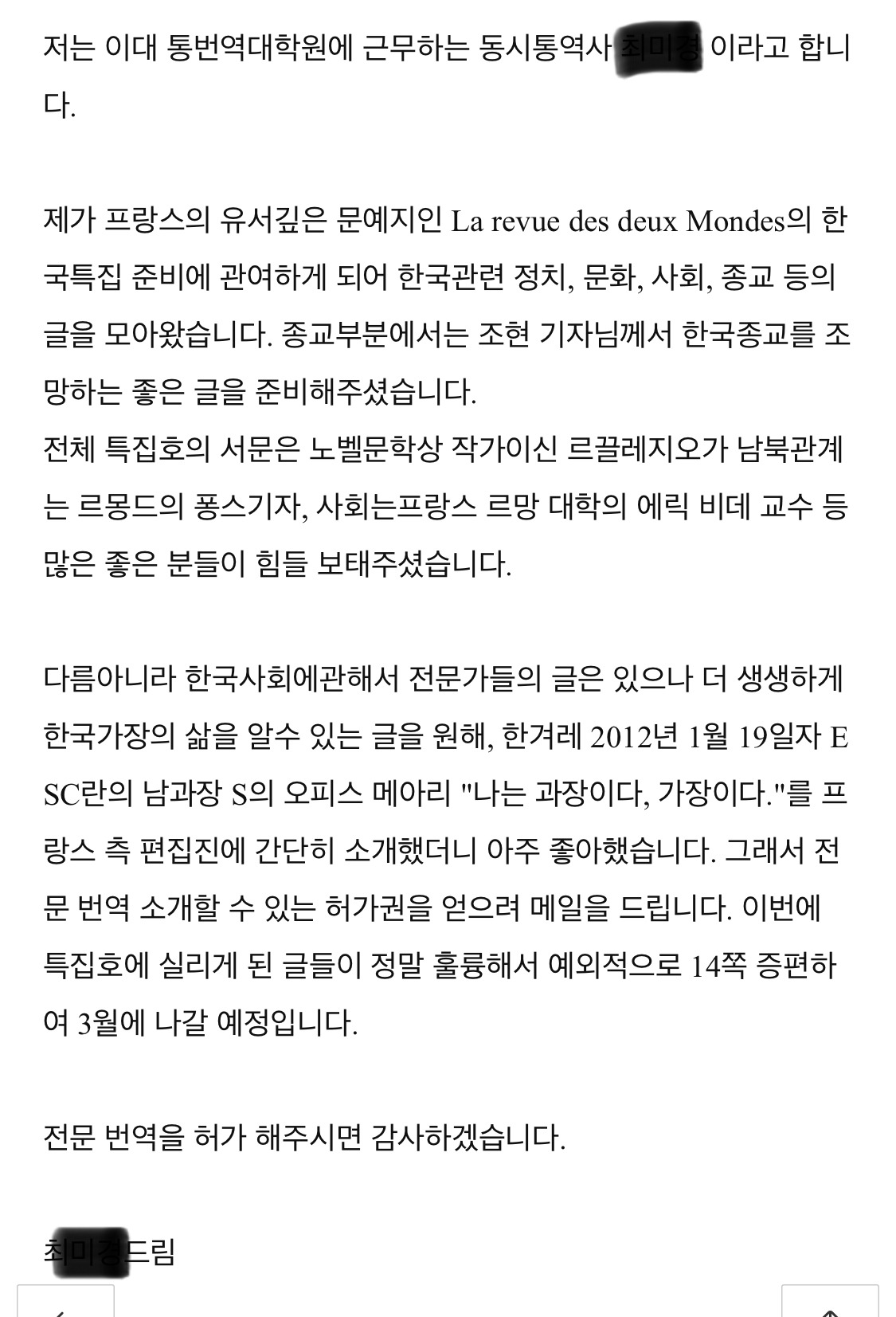동시통역사였던 모 교수께서 신문에 실린 글을 읽으시고, 해당 잡지의 한국특집에 추천하셨다네요.
