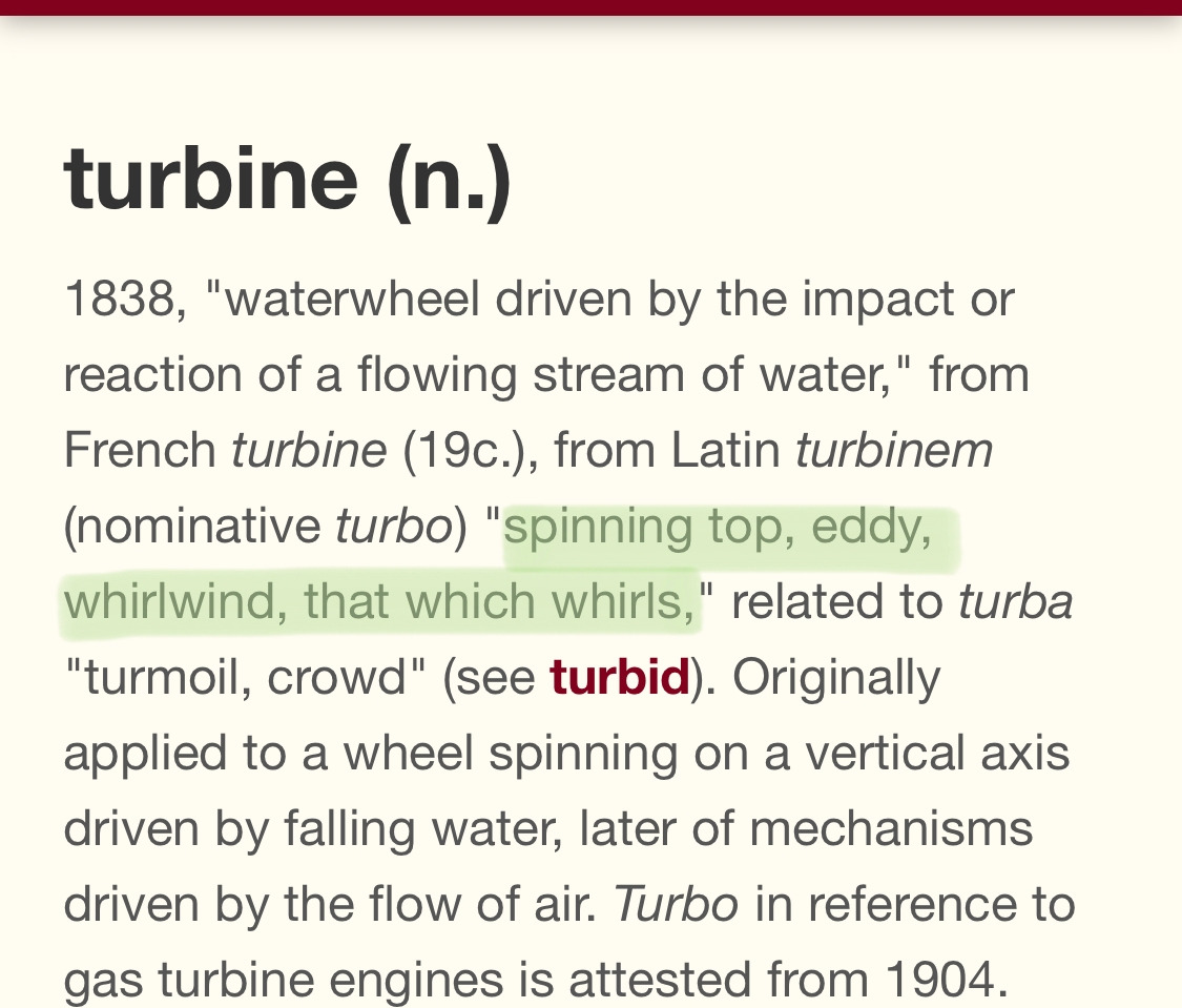 turbine은 팽이, 소용돌이, 물레방아를 의미합니다.