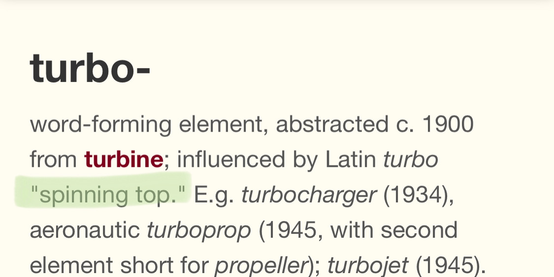 turbo는 ‘turbine~의’란 뜻으로, 라틴어 turbo는 팽이를 가리킵니다.