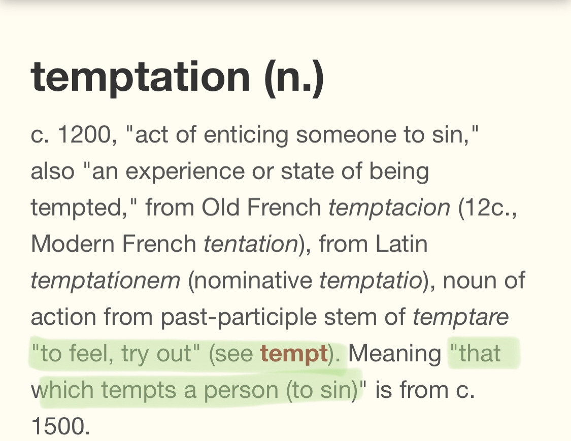 *temptation은 ‘느끼다(to feel)’, ‘해보다(try out)’란 뜻의 라틴어 ‘temptare’에서 왔습니다.