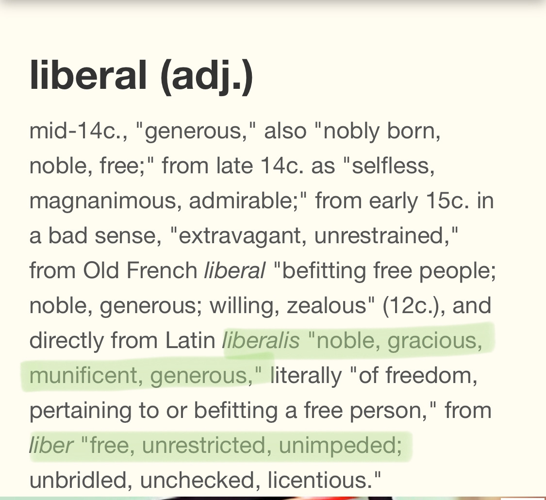 형용사 liberal은 고귀하고, 우아하고, 관대하다는 의미를 품고 있습니다.