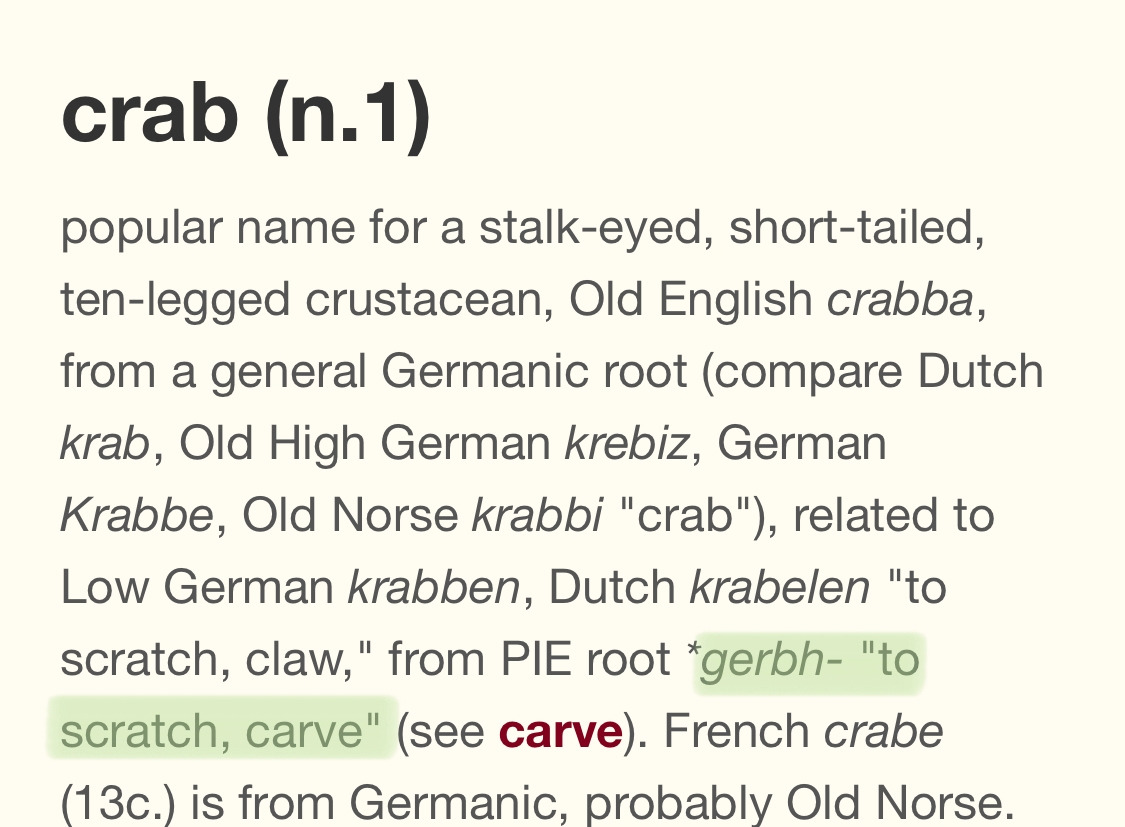 게의 영어단어 crab은 *고대인도유럽어(PIE) 뿌리 ‘gerbh’- 에서 왔습니다.