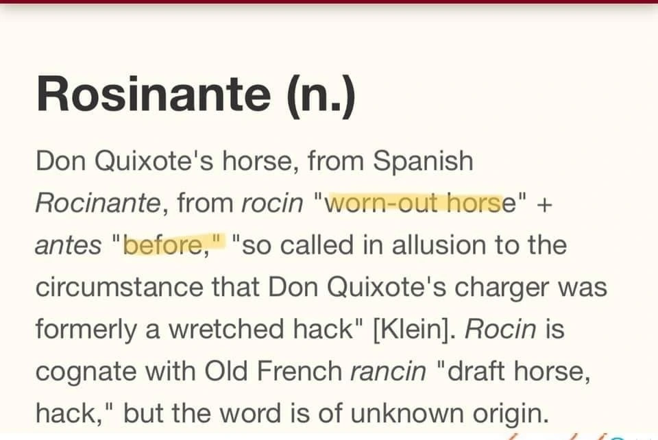 로시난테는 노쇄한 말 rocin과 before를 뜻하는 antes의 합성어입니다.
