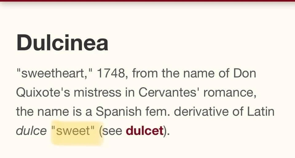 둘시네아는 달콤하다는 뜻의 라틴어 dulce에서 왔습니다.(네스카페 '돌체 구스토'도 이탈리아어로 '달콤한 맛'이란 뜻입니다)